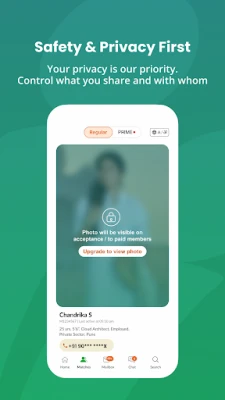 பிரீமியம் சந்தா மூலம், உங்கள் தேடலை மேம்படுத்த பல சிறப்பு நன்மைகளை அனுபவிக்கலாம். பாதுகாப்பான உடனடி அரட்டை மற்றும் குரல் அழைப்பு அம்சங்கள் மூலம் உங்கள் பொருந்தும் துணையுடன் எப்போது வேண்டுமானாலும் தொடர்பு கொள்ளலாம். அரசாங்கத்தால் அங்கீகரிக்கப்பட்ட அடையாள அட்டையுடன் சரிபார்க்கப்பட்ட நம்பகமான சுயவிவரங்களை வழங்கும் **Marathi Matrimony** "Prime" பிரிவை அணுகலாம். பிரீமியம் உறுப்பினர்கள் பிரிவில் இடம்பெற்று, அதிக கவனத்தைப் பெறலாம். மேலும், இருப்பிடம், கல்வி, ஜாதகம்/குண்டலி போன்ற முழு சுயவிவர விவரங்களையும் காணலாம். உங்கள் பாதுகாப்பு மற்றும் தனியுரிமைக்கு நாங்கள் முக்கியத்துவம் கொடுக்கிறோம். உங்கள் படங்கள், தொடர்பு விவரங்கள் மற்றும் சுயவிவரத்தை யார் பார்க்க வேண்டும் என்பதை நீங்களே கட்டுப்படுத்தலாம். SecureConnect® அம்சம் மூலம், உங்கள் மொபைல் எண்ணை வெளியிடாமல், விருப்பமானவர்களிடமிருந்து அழைப்புகளைப் பெறலாம்.