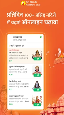 Sri Mandir - Puja & Chadhava ஆப் மூலம் இந்தியாவின் மிகப்பெரிய பக்தி தளத்தை அனுபவியுங்கள். வீட்டிலிருந்தபடியே 50+ கோயில்களுடன் இணைந்து பூஜை மற்றும் சடங்குகளில் பங்கேற்கவும், பிரசாதங்கள் வழங்கவும். சாஸ்திர சம்பிரதாயங்களுடன் ஆன்லைன் பூஜைகள் செய்து அமைதி பெறுங்கள். பக்தி பாடல்கள், பஜனைகள், ஆரத்திகள் கேட்டு மகிழுங்கள்.